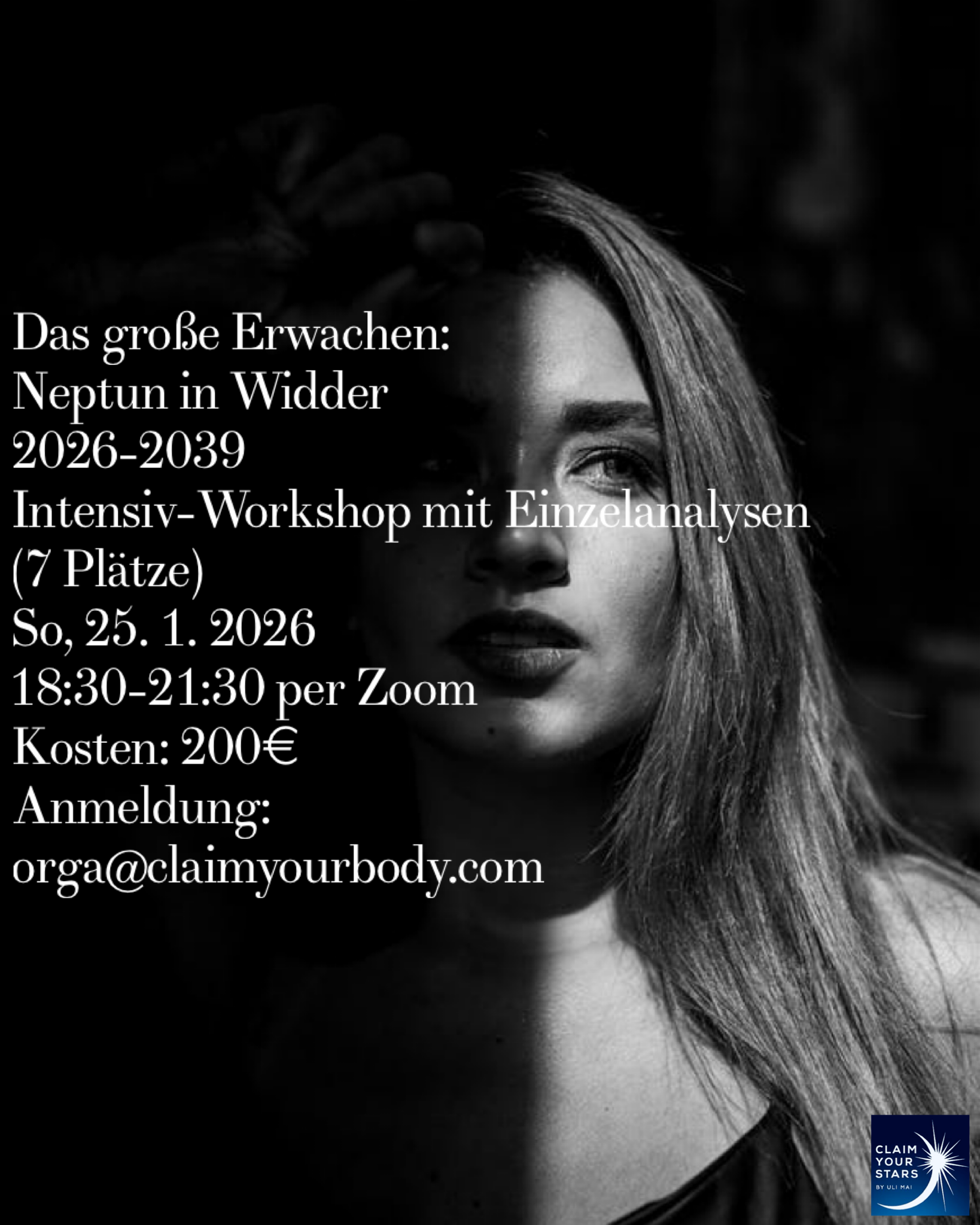 Wenn Neptun am 26. Januar 2026 endgültig für die nächsten 13 Jahre in Widder eintritt, gibt es ein Aufwachen. Klarheit, und ein Zu-Sich-Kommen. Wie das aussieht, was Du rückblickend erkennen und vorblickend intendieren und erschaffen kannst, darum wird es in diesem Kurs gehen. Mit Aufzeichnung.